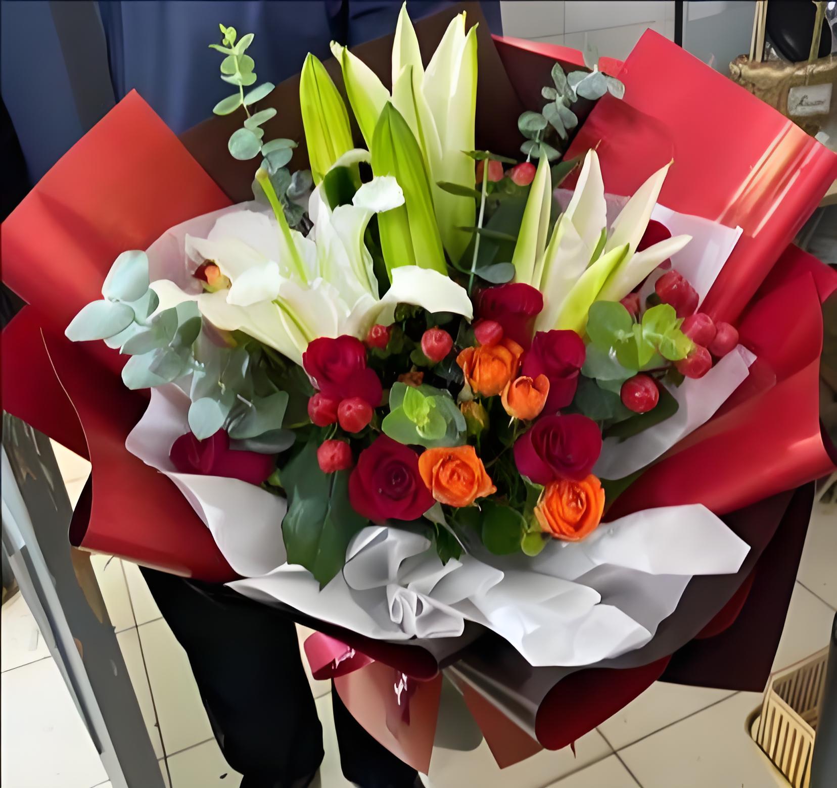 开封鼓楼区花店包11枝红玫瑰、2枝多头白百合、6枝橙色多头玫瑰、红豆、尤加利叶